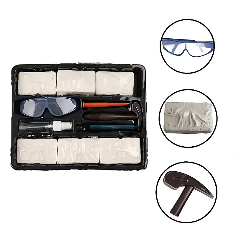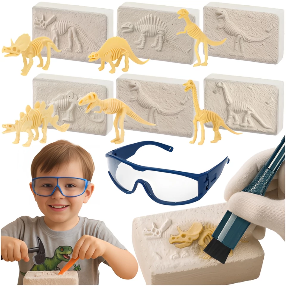 A készlet minden eleme biztonságos, nem mérgező anyagokból készült, megfelel az európai szabványoknak, így a szülők teljes nyugalommal engedhetik gyermekeiket játszani. A mellékelt eszközökkel – kalapács, véső, ecset, vízpermetező és védőszemüveg – a kicsik valósághű ásatási élményt élhetnek át, miközben felfedezik, majd összerakják az ősi lények csontvázait.