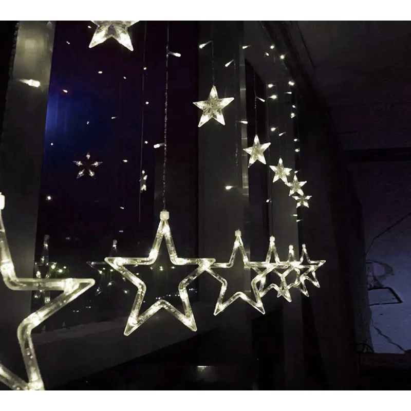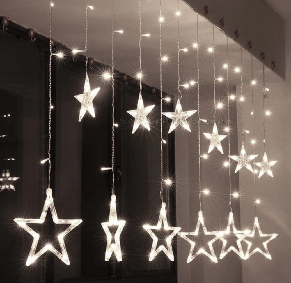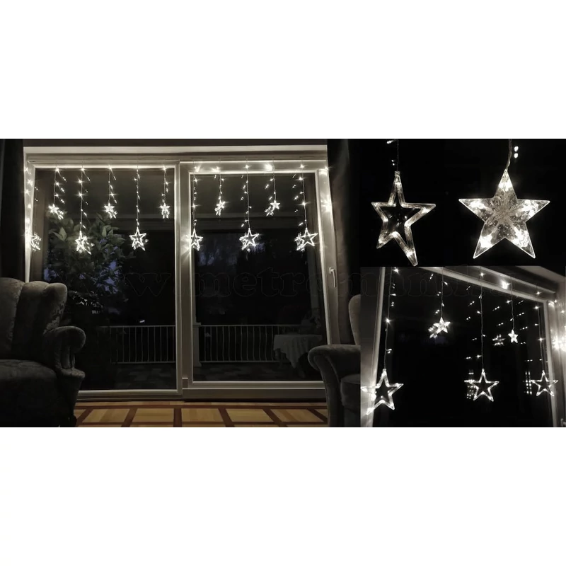 Kellemes, hidegfehér fényű karácsonyi dekorációs világítás. A fényfüggöny 250 cm hosszú, sorolható kialakítású, így lehetőség van egy dugalj használatával maximum 2 fényfüggönyt egymáshoz csatlakoztatni folytatólagosan. A fényfüggönyön található 3 db nagy méretű, 15 cm nagyságú sarló alakú hold, valamint 3 db 15 cm nagyságú csillag, továbbá 6 db kisebb méretű, 8.5 cm nagyságú csillag. A nagyobb és a kisebb formák belógása váltakozó, különböző távolságra lógnak a gerinc vezetéktől. A formákat tartó vezetékre is kerültek LED fényforrások, így szép, egységes fényfüggönyt kapunk.