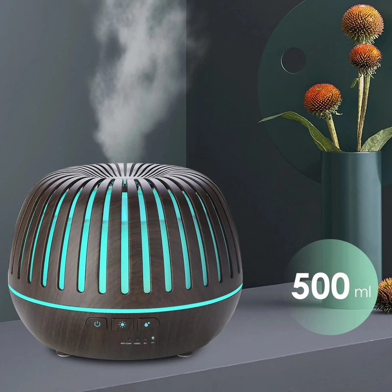 Száraz a levegő a lakásában? Jól esne egy kis felfrissülés? Használjon aromapárásítót! A készülék tisztítja a levegőt, segít pihenni és békés körülményeket teremt az alváshoz. A párologtatásnak számos pozitív élettani hatása ismert: a párásabb levegő csökkenti az asztma és a megfázás tüneteit, erősíti az immunitást, míg a hozzáadott különböző illatok csökkenthetik a stresszt. Ultraszonikus párásító technológiájának köszönhetően a vizet és az illóolajat egyenletesen juttatja a levegőbe, ezzel friss, üde hatást biztosít. Fontos, hogy megfelelő minőségű olajjal használja a készüléket, figyelembe véve, hogy egyes olajok túl erősek lehetnek a gyerekek számára. Ha gyerekek is vannak a helyiségben a diffúzort minimális illatanyaggal, vagy illatanyag nélkül is használja. Rendszeres alkalmazásával olyan problémák is megszüntethetőek, mint a szemek égése, a hányinger vagy a fejfájás. Az aromaterápiás párologtató elegáns fa mintája és LED fénye jól mutat majd a szobában! A készülék megjelenésével nem csak feldobja a környezetet, de emellett kellemes atmoszférát is teremt. A csendesen működő párologtató 500 ml-es tartályának köszönhetően akár 8 órán keresztül is képes működni.