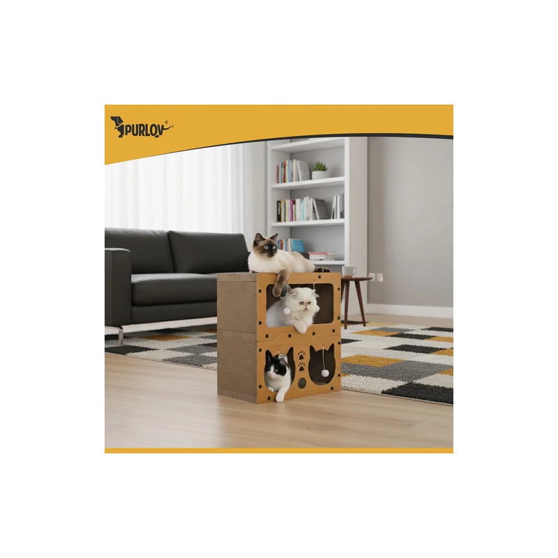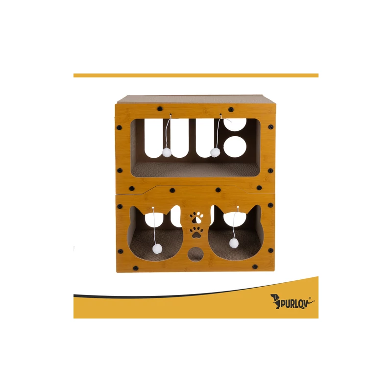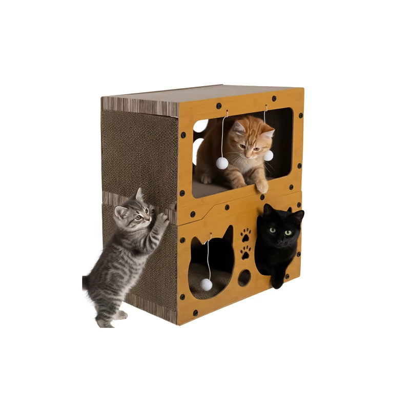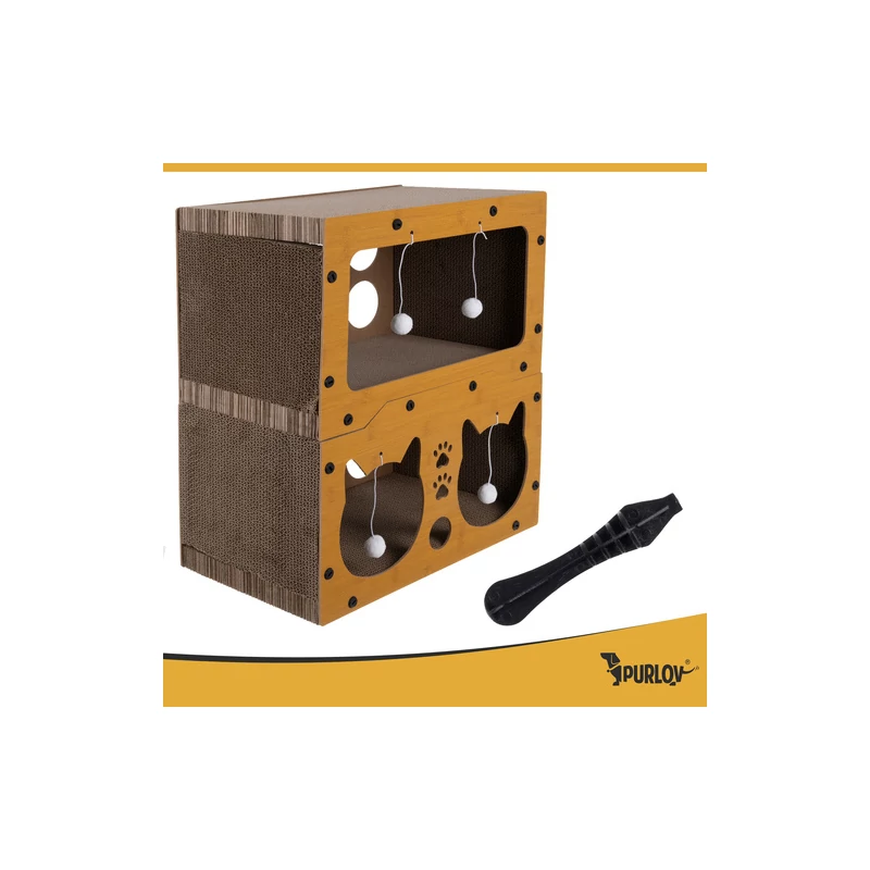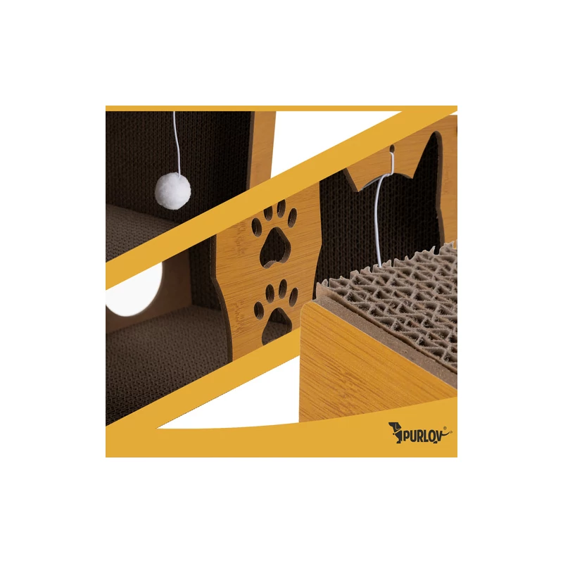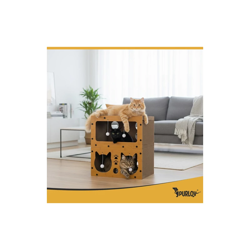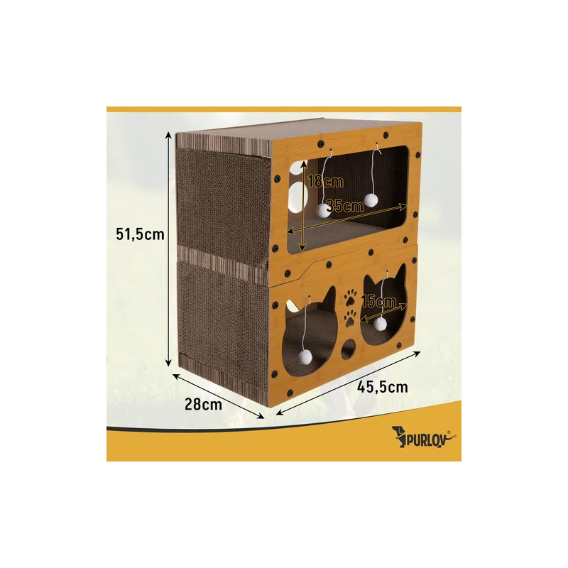 A 3 az 1-ben emeletes macskabútor házzal és kaparófával elegancia, tartósság, szórakozás és kényelem kombinációja macskája számára. A kemény farostlemez táblákból készült kétszintes szerkezet stabilitást és biztonságot garantál, a 4 golyó pedig a napi adag mozgást és szórakozást biztosítja. A természetes, kemény felület ösztönzi a kaparást, így végre bútorai is fellélegezhetnek, kedvence pedig szabad teret kap a pihenésre és a játékra.