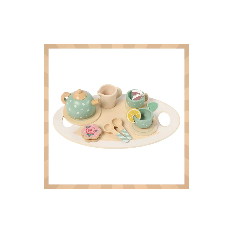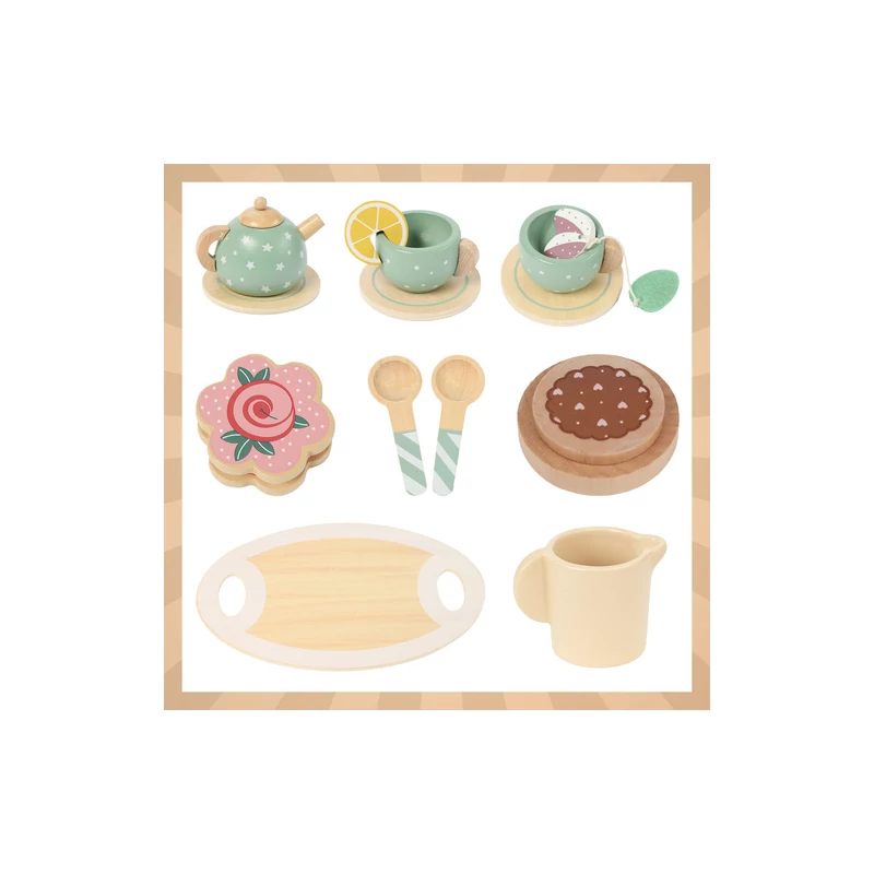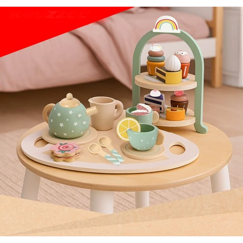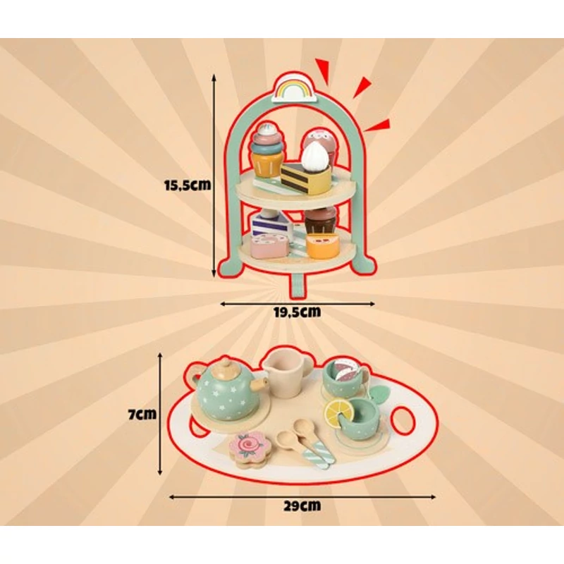 Fából készült játék teás készlet és süteménysziget 15 db kiegészítővel, süteményekkel, tortatartóval