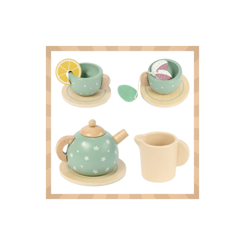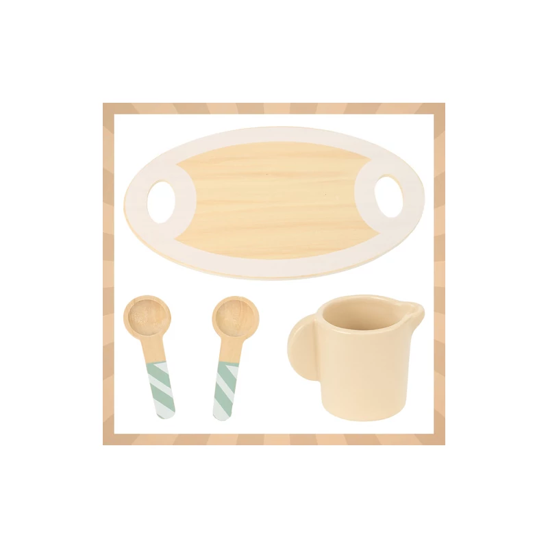 - anyag: edények (fa + melamin) és evőeszközök (fa) + tálca és alátétek (rétegelt lemez) + kiegészítők (rétegelt lemez + nem szőtt szövet + poliészter) + tortatartó (farostlemez + rétegelt lemez), ételek (farostlemez + fa)