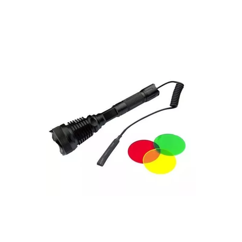 Hatalmas fényerejű lámpa, ami akár puskacsőre is helyezhető, így airsoft játékosok számára is kiváló választás lehet! Professzionális, strapabíró, alumínium testes, víz- és korrózióálló kiszerelés, amely extra erős T6 LED panelének köszönhetően számtalan helyen hasznos társ lehet: használható túrázásnál, kirándulásnál, vészhelyzetben, tartalék fényforráskánt, jelzőfénynek, keresőlámpának, de akár egy adott terület folyamatos bevilágítására is. Mindezek közül technológiája miatt a keresőlámpa funkció áll hozzá legközelebb. Két darab 18650 mAh-es 3.7V-os akkumulátorról üzemel, 1000 lumenre képes, ami túlszárnyalja szinte az összes ismert típus teljesítményét. Több üzemmóddal rendelkezik, a folyamatos világítás mellett villogás, és SOS morze funkció is beállítható rajta. Állandó lakója lehet egy hátizsáknak, vagy épp az autó kesztyűtartójának, azonban méreténél fogva ez már nem a kisebbfajta zseblámpák csoportjába sorolható. Tartozéka egy hálózati töltő, egy szivargyújtóról üzemelhető töltő, egy szerelék, amivel fegyvercsőre tudjuk felerősíteni, egy lengőkapcsoló, mellyel a markolatról tudjuk üzemeltetni a lámpát, továbbá három színezett lencse, melyeket tetszés szerint cserélhetünk a lámpán, a megfelelő színt elérve.