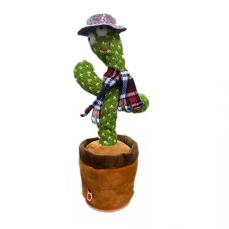 Interaktív visszabeszélő táncoló, zenélő, világító kaktusz, hangfelvétellel, lila kalappal, sállal, akkus