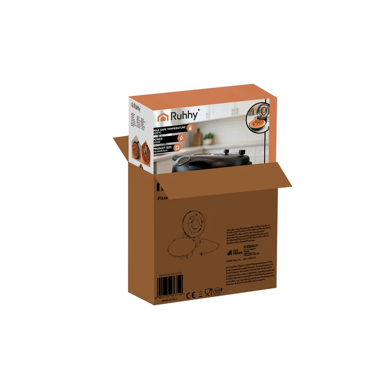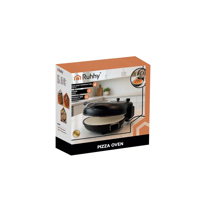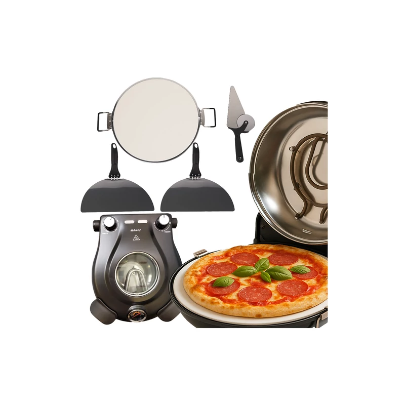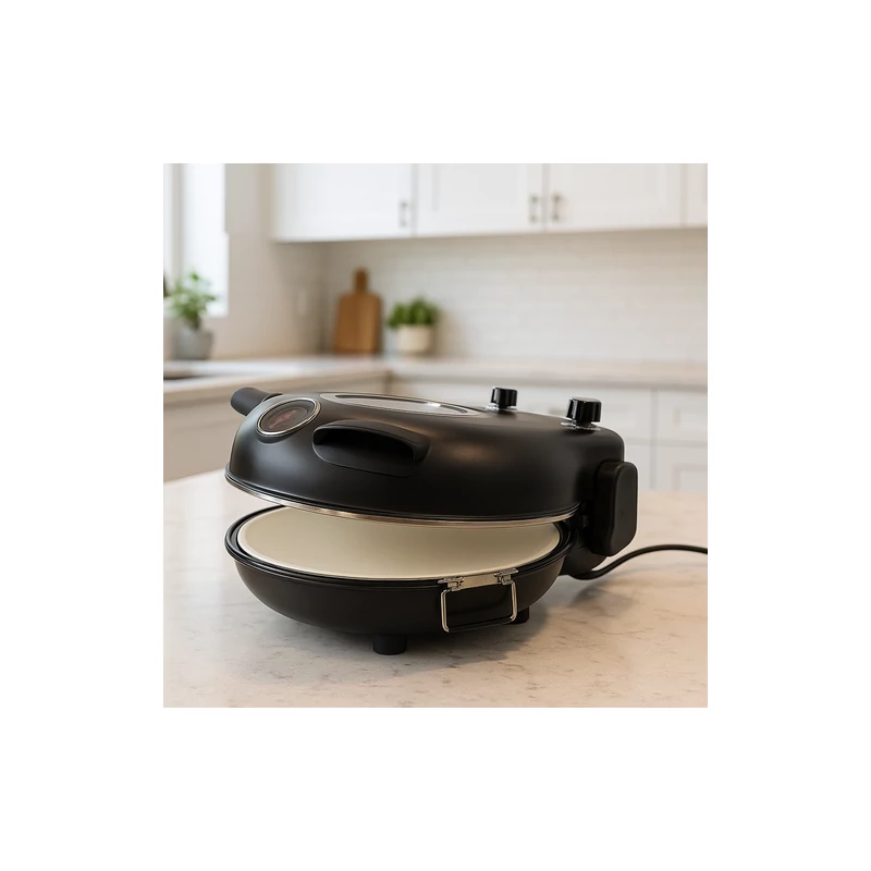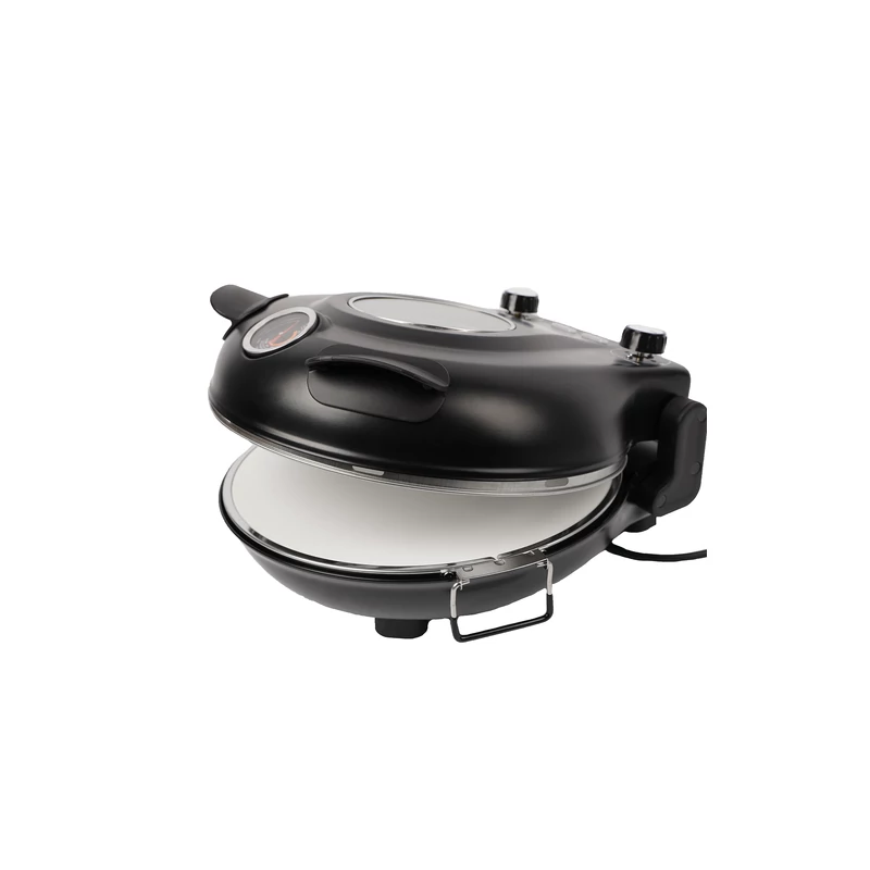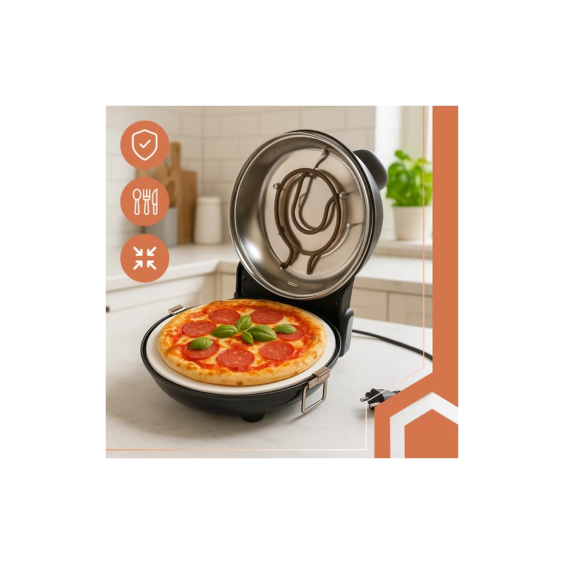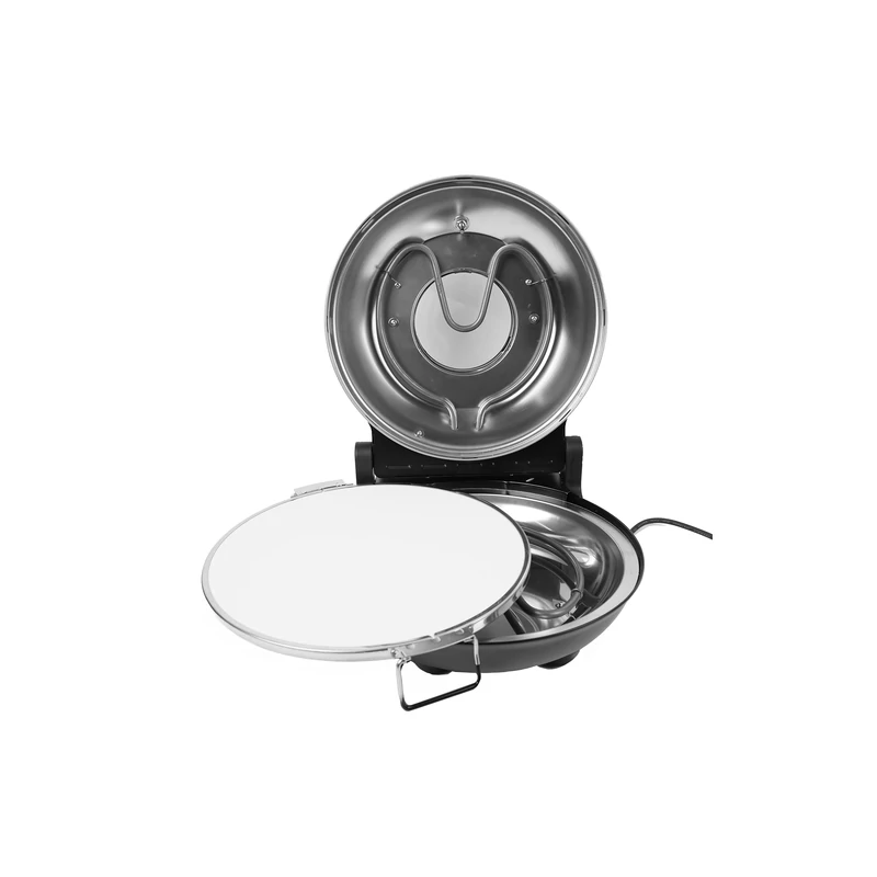 Maximum 450 °C-ra melegíthető otthoni pizzasütő, mely az olasz pizzakemencék mintája alapján lett tervezve. Kerámiakő sütő felülete légáramlásos hőszabályzása és dupla fűtőszál kialakítása hasonló sütési körülményeket teremt, mint a pizzériákban található hagyományos vagy elektromos pizzakemencék. A szabályzógombok, a hőmérő és a jelzőfények teljes irányítást biztosítanak, az átlátszó fedél pedig lehetővé teszi, hogy a sütés folyamatát a fedél kinyitása nélkül is figyelemmel kísérje. Ideális sütéshez és ételek melegítéséhez. Időzítheti és szabályozhatja a sütés idejét, valamint hőfokát a tökéletes eredmény érdekében. Tökéletes hagyományos vagy nápolyi stílusú pizzákhoz, lepények és kenyérlángosok elkészítéséhez is.