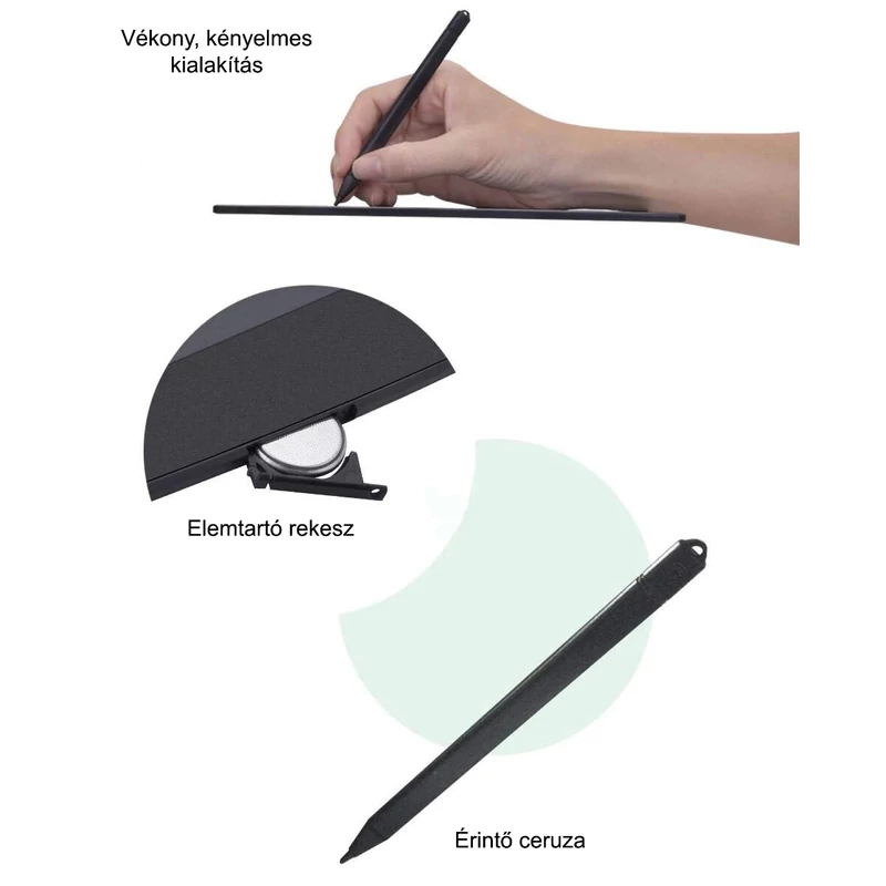 Rajzolj, jegyzetelj, vagy hagyj üzenetet környezettudatosan, papír nélkül! Az írótábla rendkívül könnyű, súlya mindössze 110 gramm. A készülék kijelzője nyomásérzékeny LCD panel, melyre a mellékelt érintőceruzával, vagy bármilyen tompa végű eszközzel lehet írni vagy rajzolni. A képernyő tartalma egyetlen gombnyomással törölhető, és újra teleírható. A felírt tartalom mindaddig a kijelzőn marad, amíg azt a törlés gombbal nem töröljük.