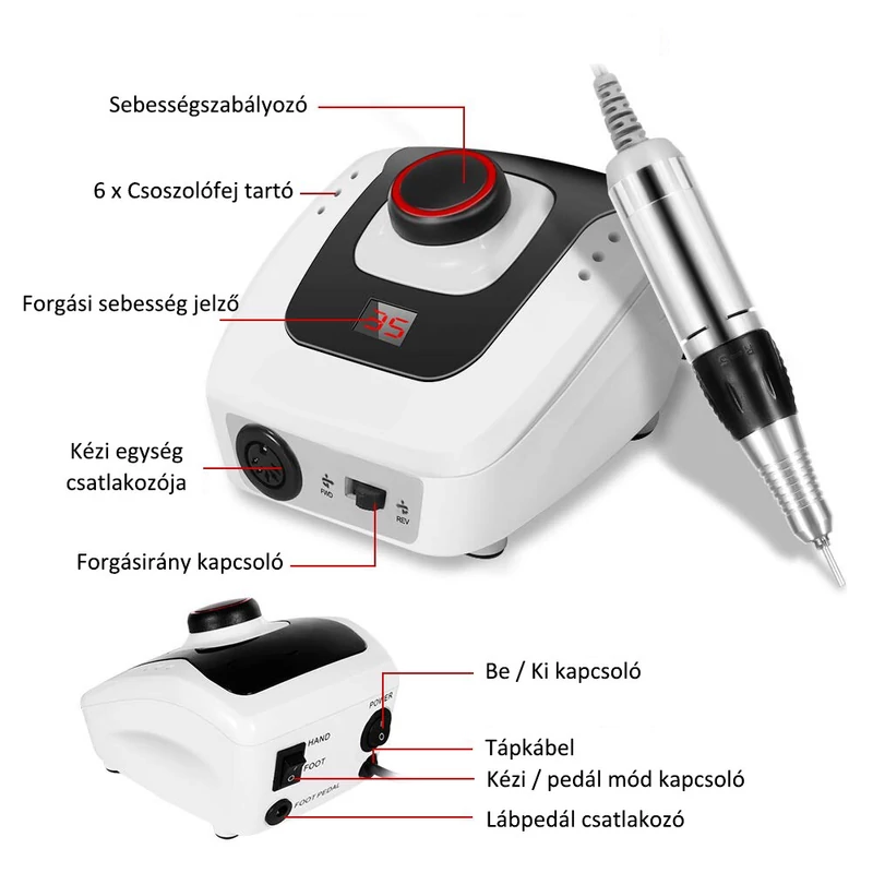 Extra kisméretű és ultrakönnyű, professzionális műköröm csiszológép, amelynek egyszerű használatával könnyedén széppé varázsolhatja körmeit. Nem kell a kézi reszelővel órákkal bajlódni, hiszen elektromos csiszológépünkkel percek alatt eltávolíthatja a fedőlakkot és a színt, vagy akár teljes manikűrt készíthet általa. Kialakítása miatt kényelmes, a csiszolás erőssége pedig manuálisan állítható, választható fokozatban a fordulatszámnak megfelelően. Maximális fordulatszám: 35000/perc. Felülettől és formától függően 4 féle csiszolófej közül választhat, amelyek tartozékai a csomagnak. Emellett a munkafolyamatot egy lábpedál is segíti, kipróbálásához csak kapcsolja át a „HAND” feliratot „FOOT”-ra.