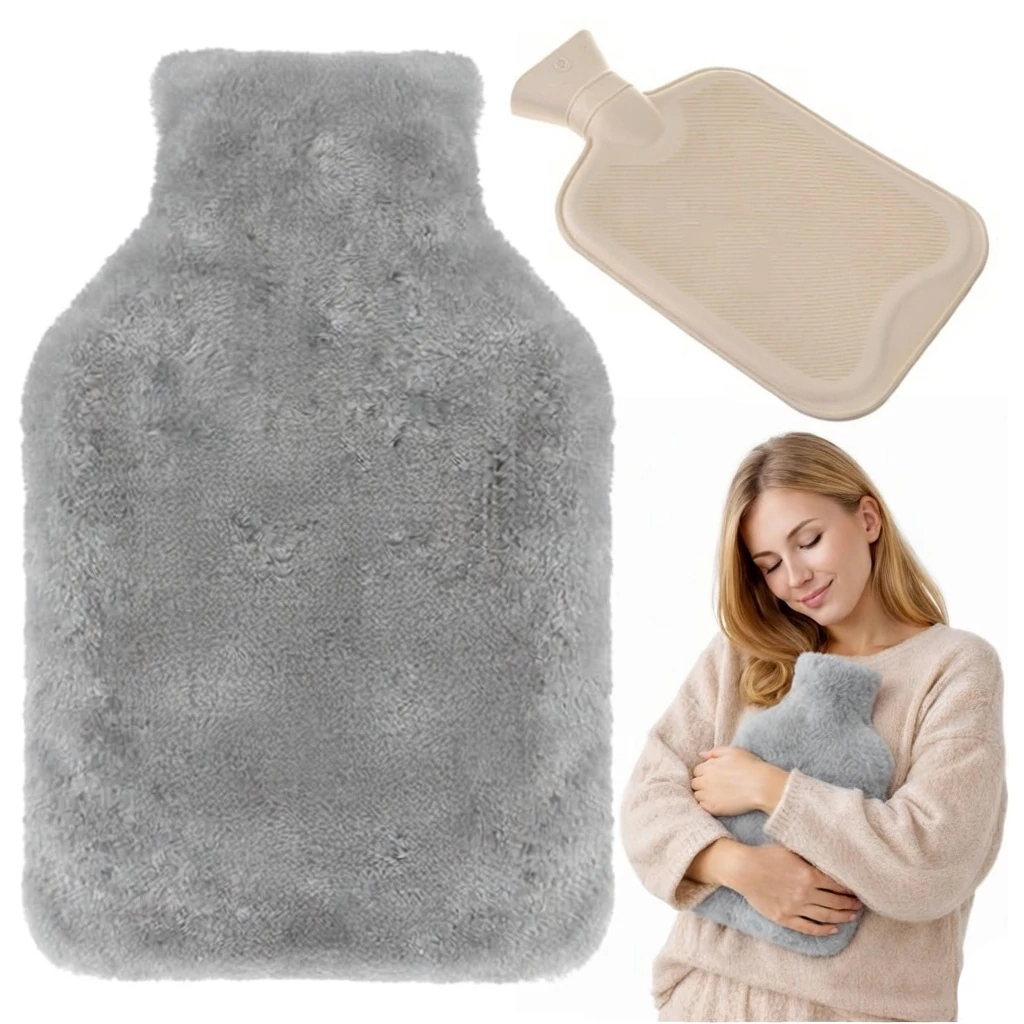 Nagy méretű hőtartó gumi palack puha szürke plüss huzattal, izomlazításhoz, hasi görcsök és megfázás enyhítésére, mosógépben mosható huzattal, 1,8L