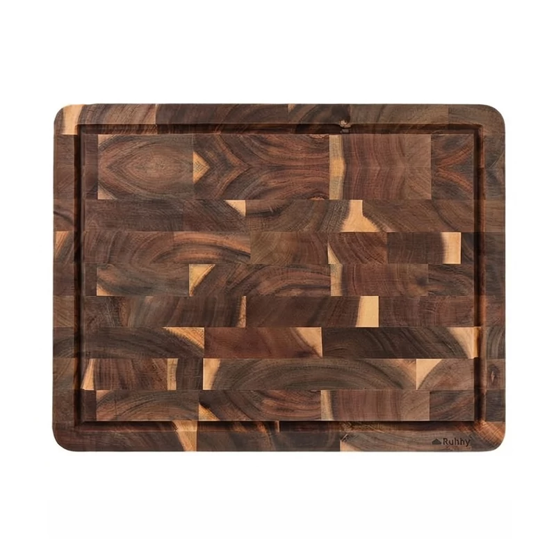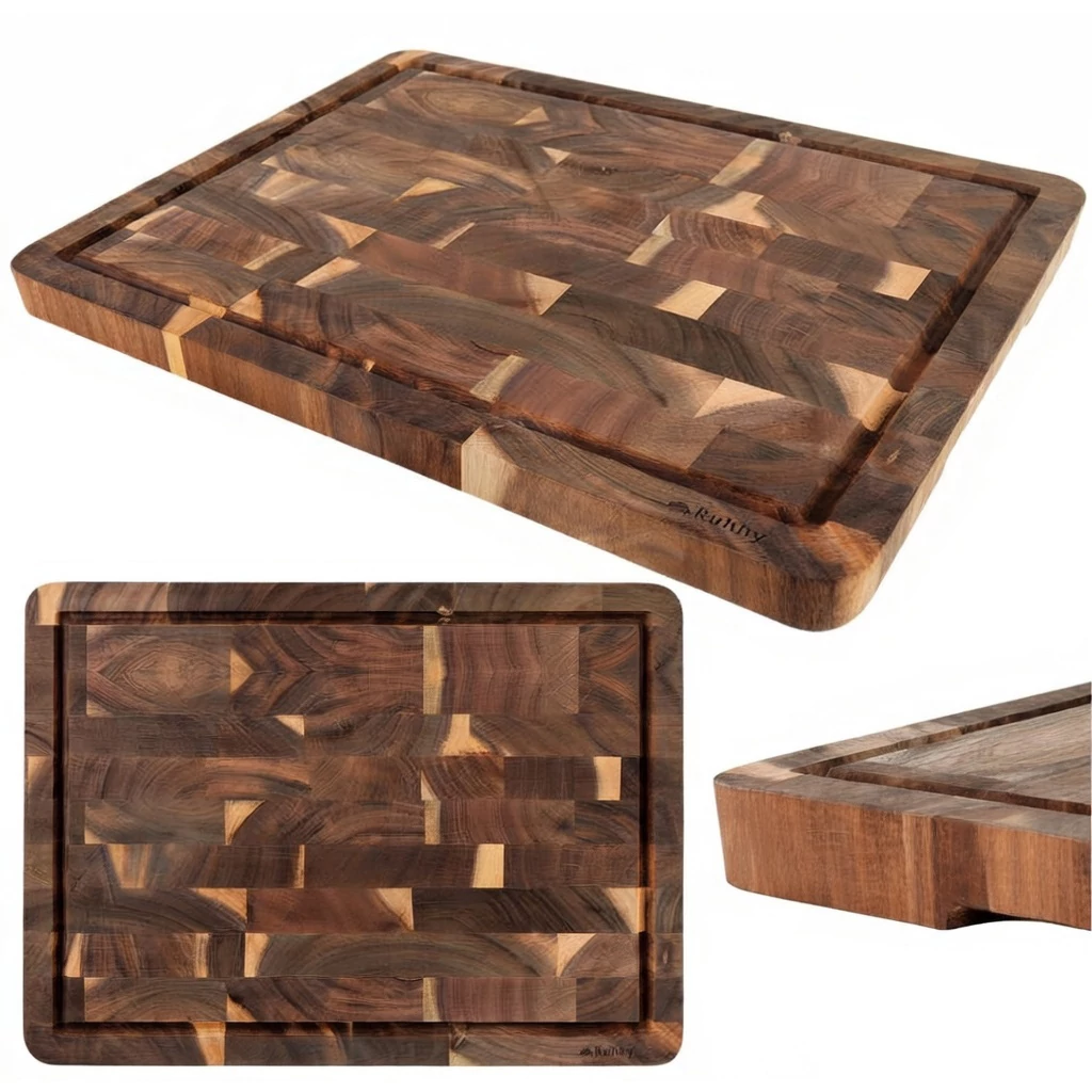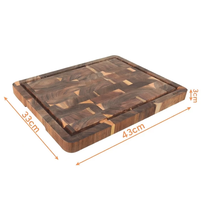A deszka különlegessége az élfa (end-grain) kialakítás, amely nemcsak esztétikailag lenyűgöző, hanem rendkívül ellenálló a vágási nyomokkal szemben, így élettartama többszöröse a hagyományos modellekének. A praktikus légyűjtő barázda tisztán tartja a munkapultot, az alján található mart fogantyúk pedig kényelmes és biztonságos fogást tesznek lehetővé tálaláskor. Legyen szó húsok szeleteléséről vagy sajttálak elegáns szervírozásáról, ez a deszka minden konyha dísze lesz.