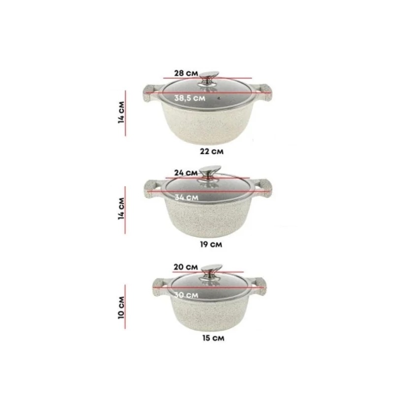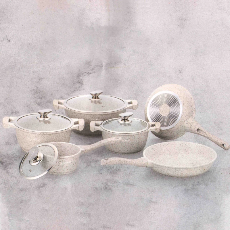 Exkluzív, modern formavilágú, öntött alumínium edénygarnitúra. 5 rétegű speciális márvány bevonatának köszönhetően a készülő ételek nem tapadnak le benne sütés vagy főzés közben. Az edények használhatók hagyományos gáz, valamint elektromos kerámia és indukciós főzőlapon is. Az edények hőállóak, akár sütőbe is betehetőek.
