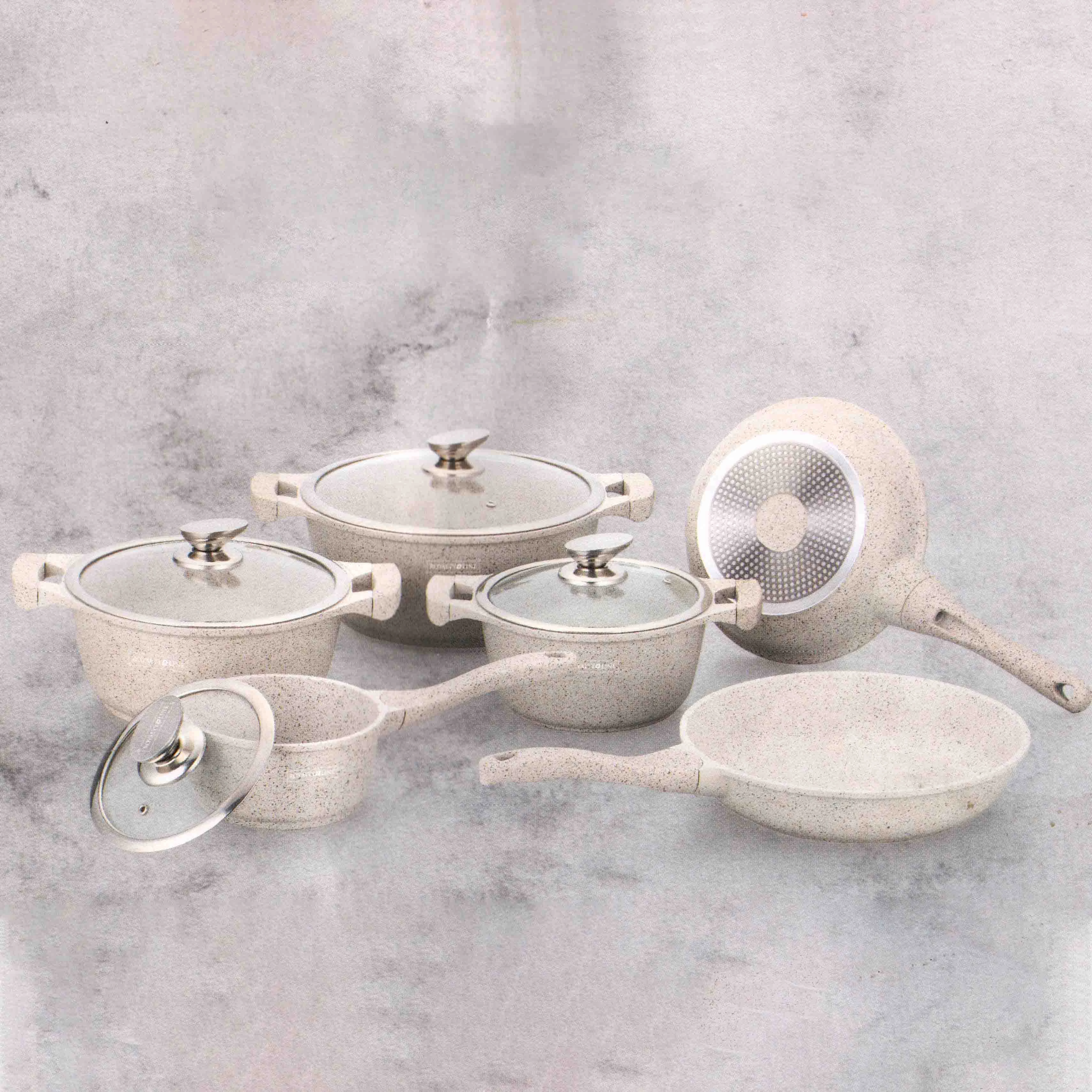 Royalty Line 10 részes, márvány bevonatos, tapadásmentes edénykészlet, üveg fedőkkel, krém szín