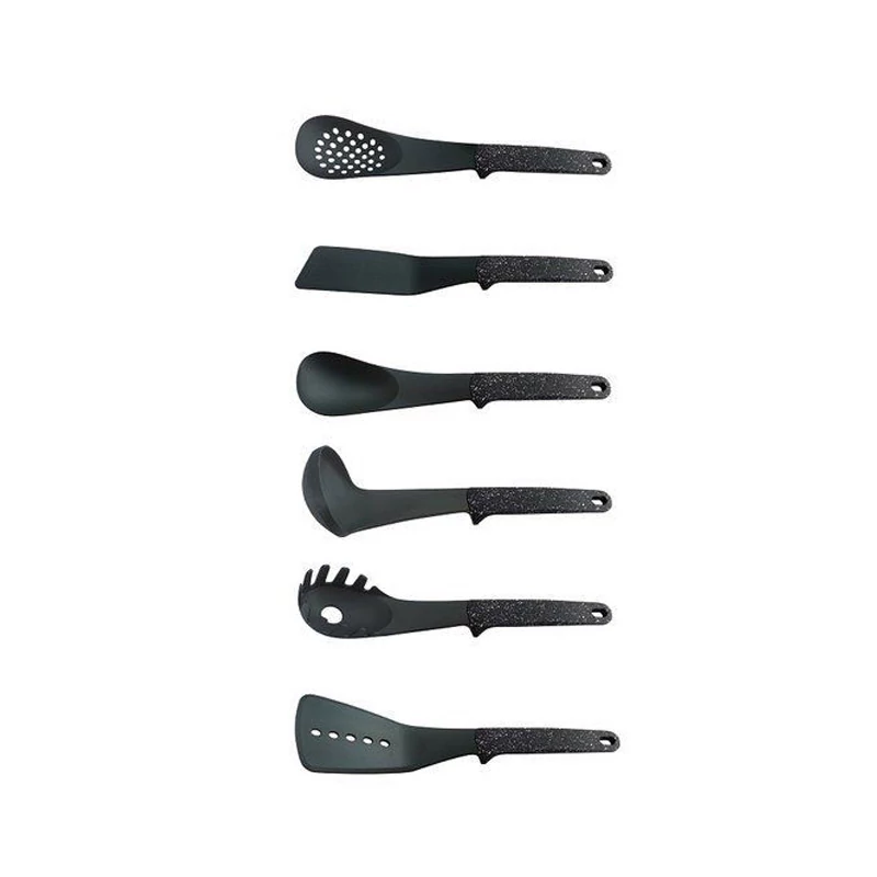 Kényelmes tapintású, egyedi megjelenésű, hét részből álló készlet, amely garantáltan egyedi eleme lesz konyhájának. A fahatású nyelek biztos fogást adnak, bármely konyhai művelet elvégzése közben. A Royalty Line konyhai eszközei nylonból készülnek, így használat közben nem karcolják meg az edények, serpenyők márvány bevonatát. A tökéletes tárolás érdekében egy darab állvány is található a csomagban. Az eszközök színe matt fekete, fa hatású nyéllel.
