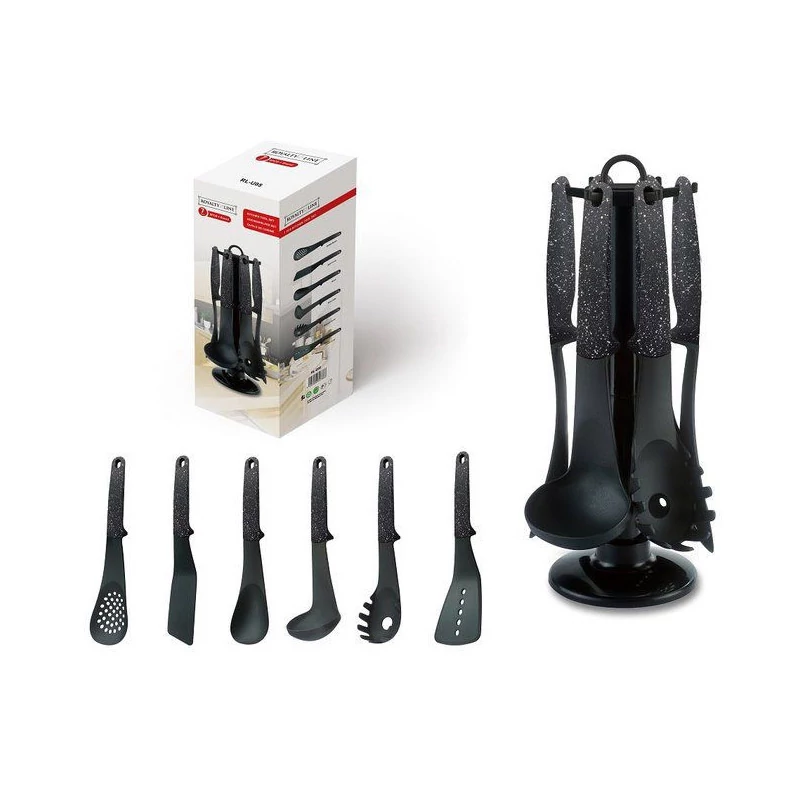 A készlet 6 db különböző konyhai eszközt és 1 db állvány tartalmaz: