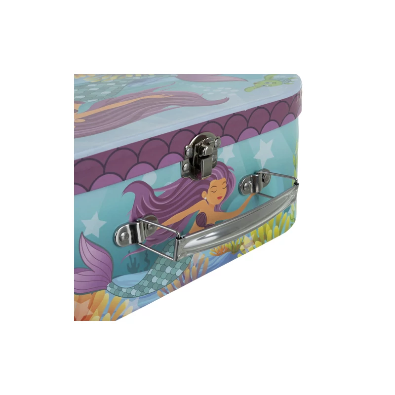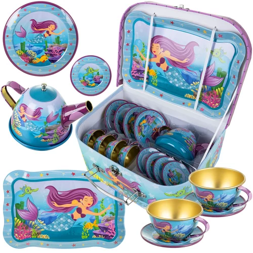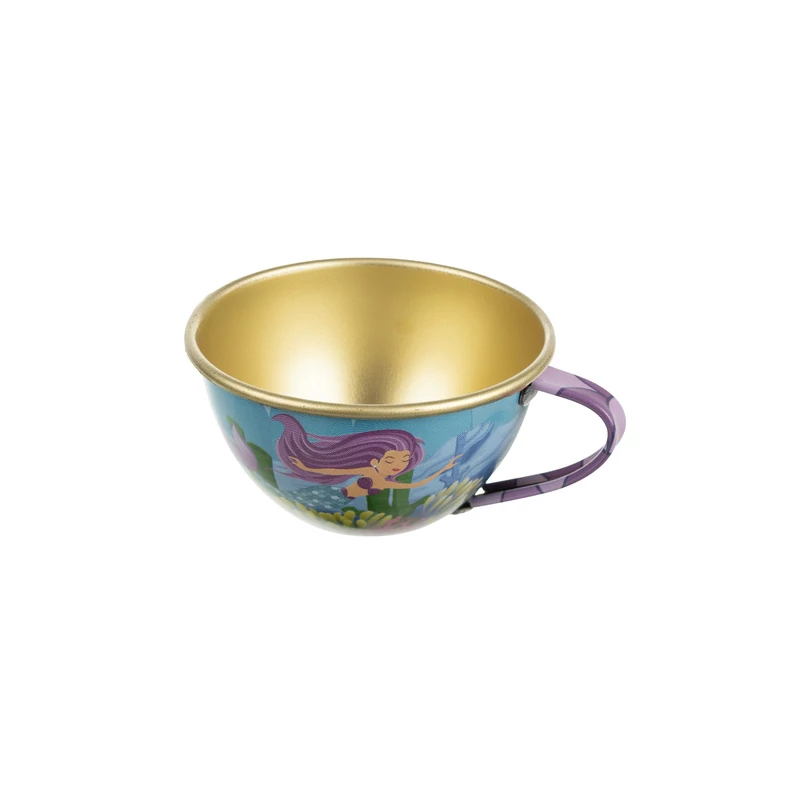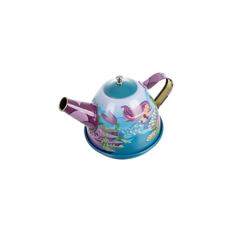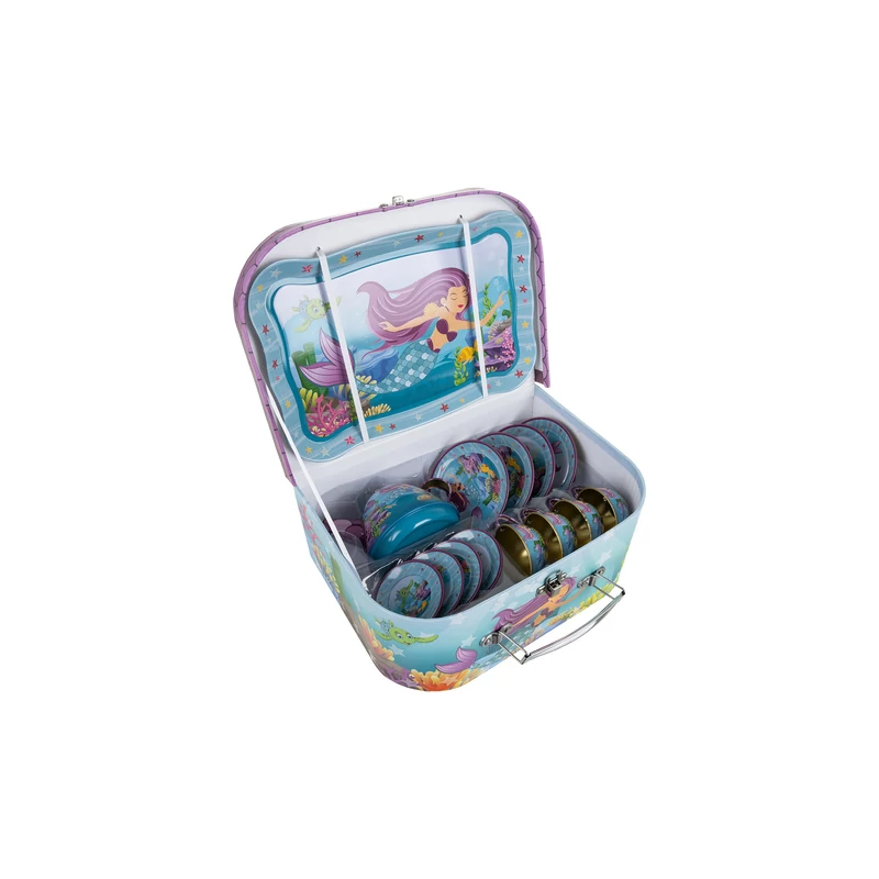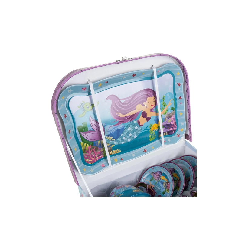 Sellő mintás játék teáskészlet dobozban, teáskannával, tálcával, 9 részes, fém készlettartóban, pasztell színű