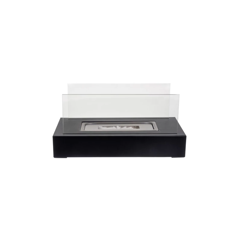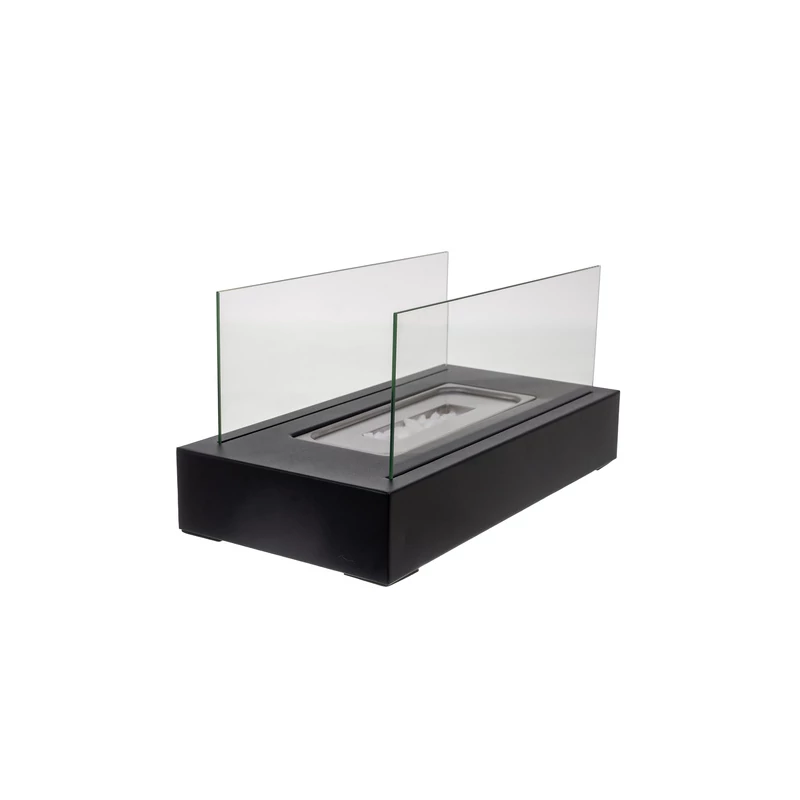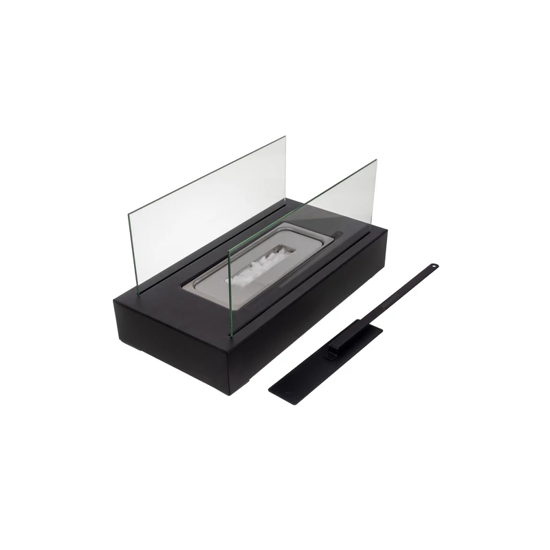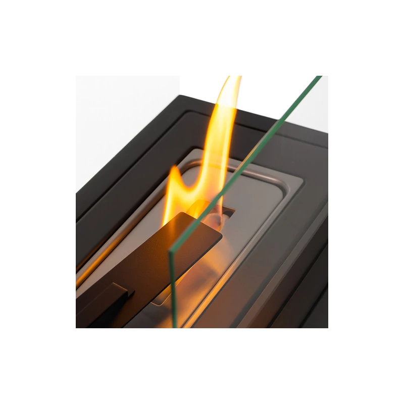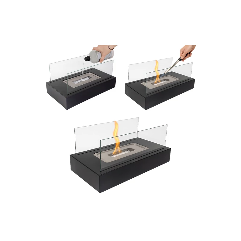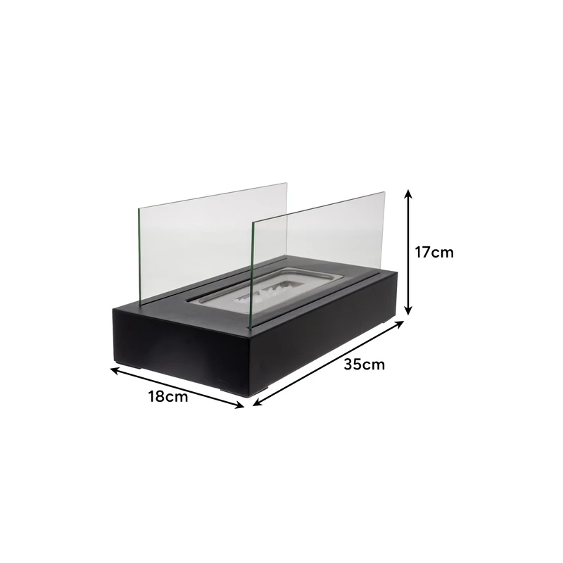 Szabadon álló BIO kandalló otthonra és teraszra, füstmentes, bioetanol bioüzemanyaggal működő, üvegfallal, hőtartó kavicsággyal, 35 x 18 x 17 cm, fekete
