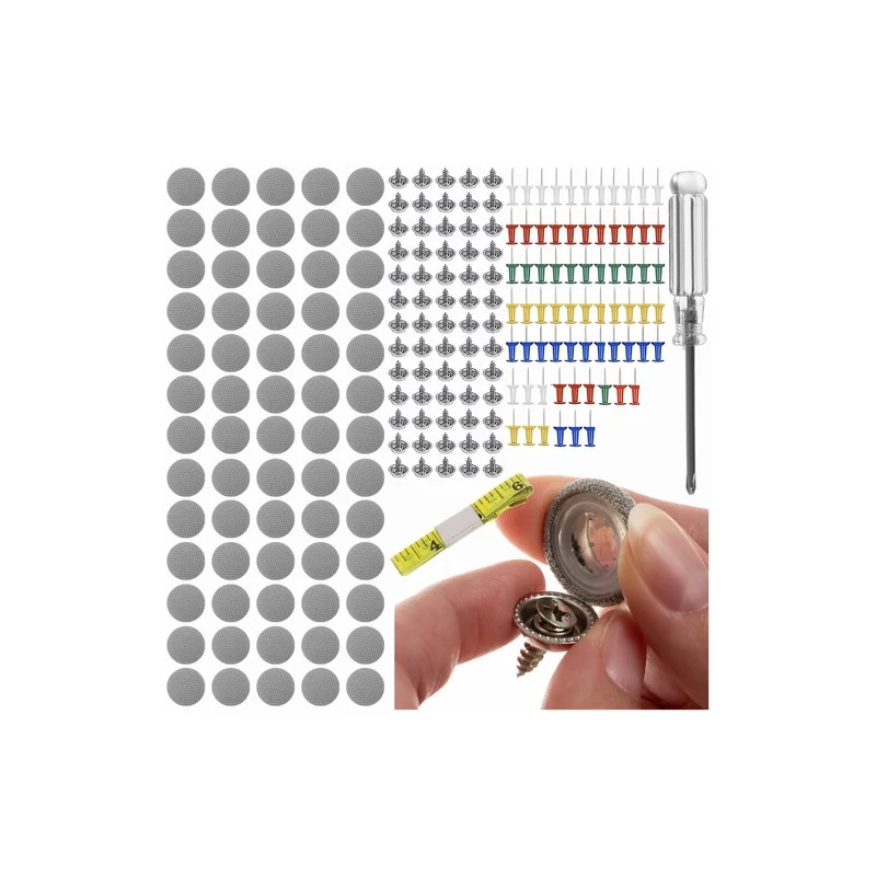 A készlet tartalmazza az összes szükséges elemet a megújításhoz. 70 db rögzítő - szegecsborítás, szegecsek csavarokkal, színes jelölőtű -, továbbá egy csavarhúzó és egy mérőszalag, teszik lehetővé a teljes javítást további eszközök beszerzése nélkül.